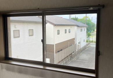 内窓をいれることで暑い夏の日のエアコンの効きはよくなり結果エアコンの電気代金も削減となります。南面の窓は透明ガラスでカーテンがなければ丸見えでしたが、型ガラス仕様にしたため日中レースのカーテンはなくてもよくなっています。