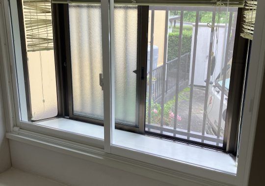出窓のの浴室壁側の近いところへ内窓を入れました。ペアガラスのため断熱性アップ。サッシ枠・障子枠も樹脂のため錆にも強く、アルミでないため熱伝導率が低くより断熱効果を高めています。