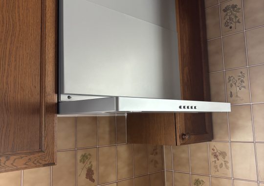 レンジフードの色をキッチンの雰囲気に合うように色決めからお客様と相談して満足していただけるものを取り付けられました。