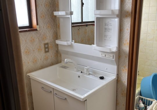 以前2ハンドル水栓の水漏れがありコマを交換した事がきっかけで交換希望の依頼をいただきました。新しく設置した洗面は奥行が6センチほどコンパクトになっています。コンパクトでも洗面ボールは大型です。洗面所のスペースが広くなり使いやすくなっています。