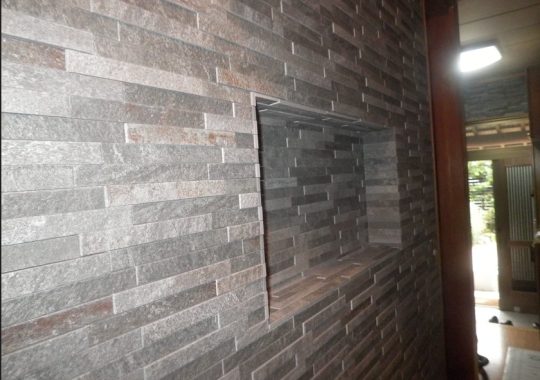 壁の下地から改修をして壁に新たにニッチを作成しています。壁全面エコカラット取付で上品で高級感あふれる廊下壁となっています。