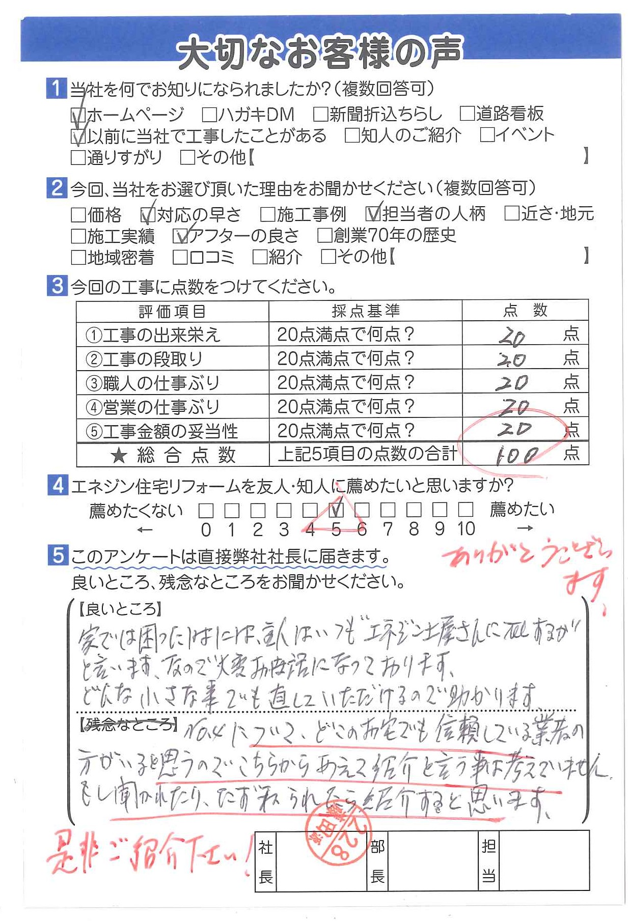 | 工事の出来栄え | 20点満点で何点? | 20点 |