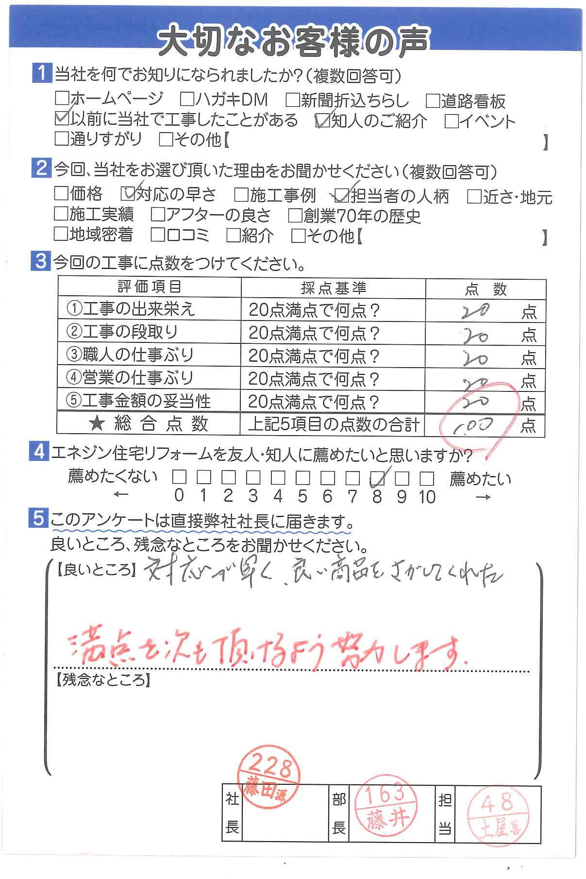| 工事の出来栄え | 20点満点で何点? | 20点 |