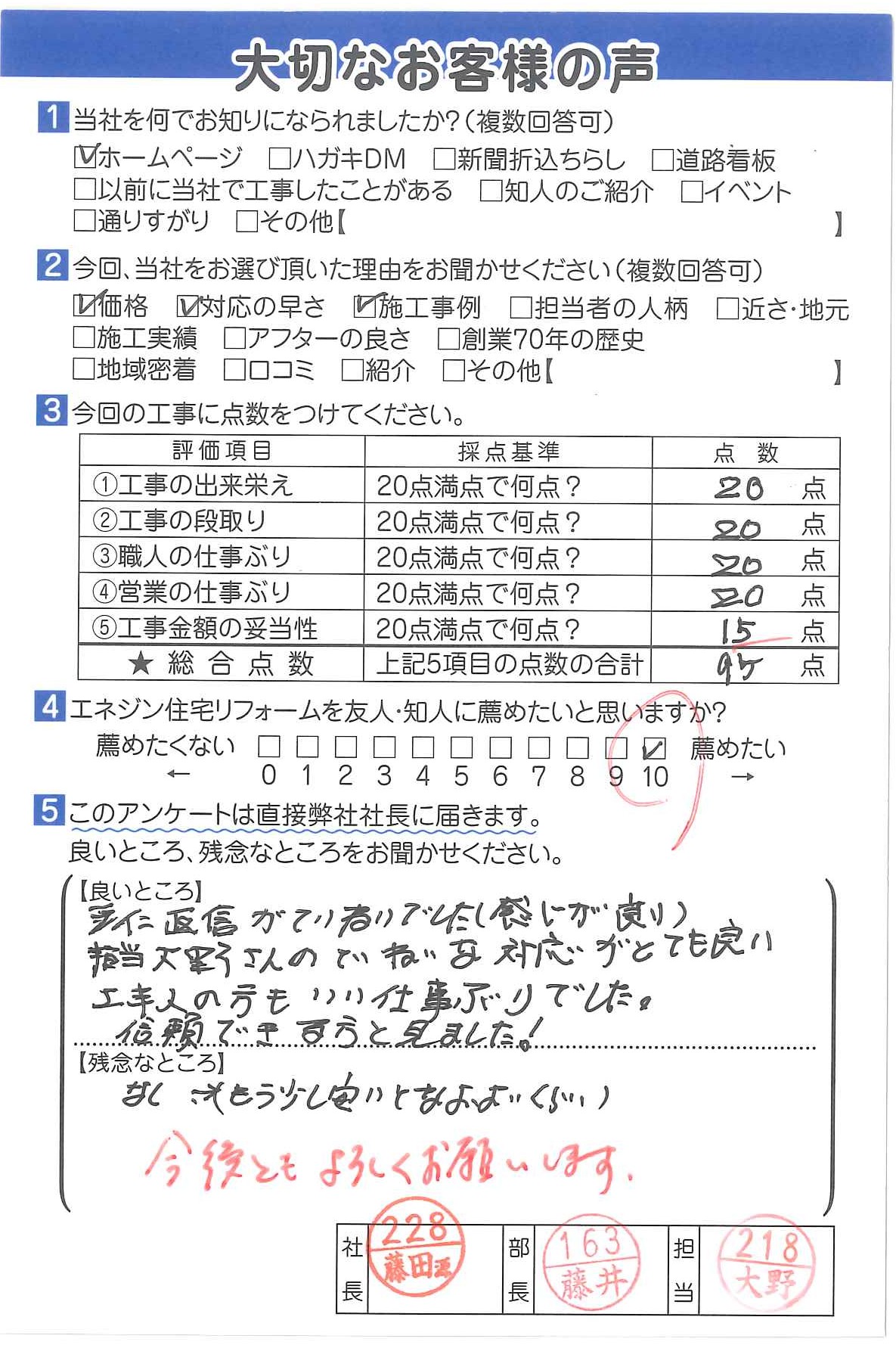 「ライン返信がていないでした(感じが良い)。 担当大野さんのていねいな対応がとても良い。工事人の方もいい仕事ぶりでした。信頼できる方と見ました!」