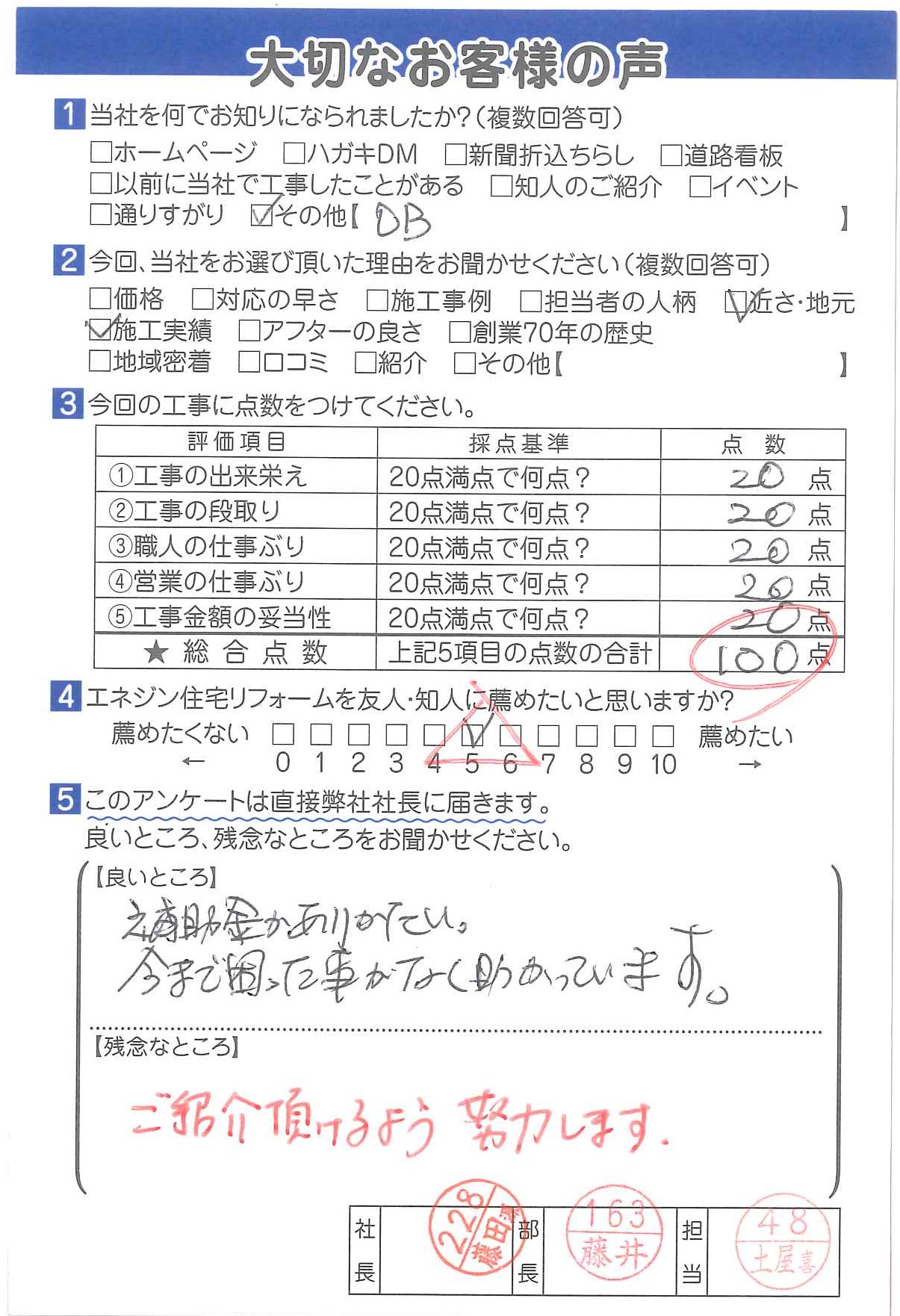 | 工事の出来栄え | 20点満点で何点? | 20点 |