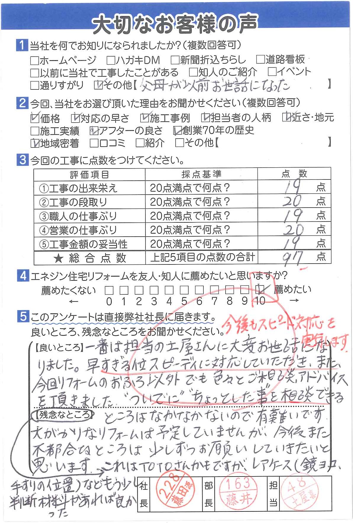「一番は担当の土屋さんに大変お世話になりました。早すぎる位スピーディーに対応していただき、また、今回リフォームのお風呂以外でも色々とご相談、アドバイスをいただきました。‘ついでに‘ちょっとしたことを相談できるところはなかなかないのでありがたいです。大掛かりなリフォームは予定していませんが、今後また不都合なところは少しずつお願いしていきたいと思います。」
