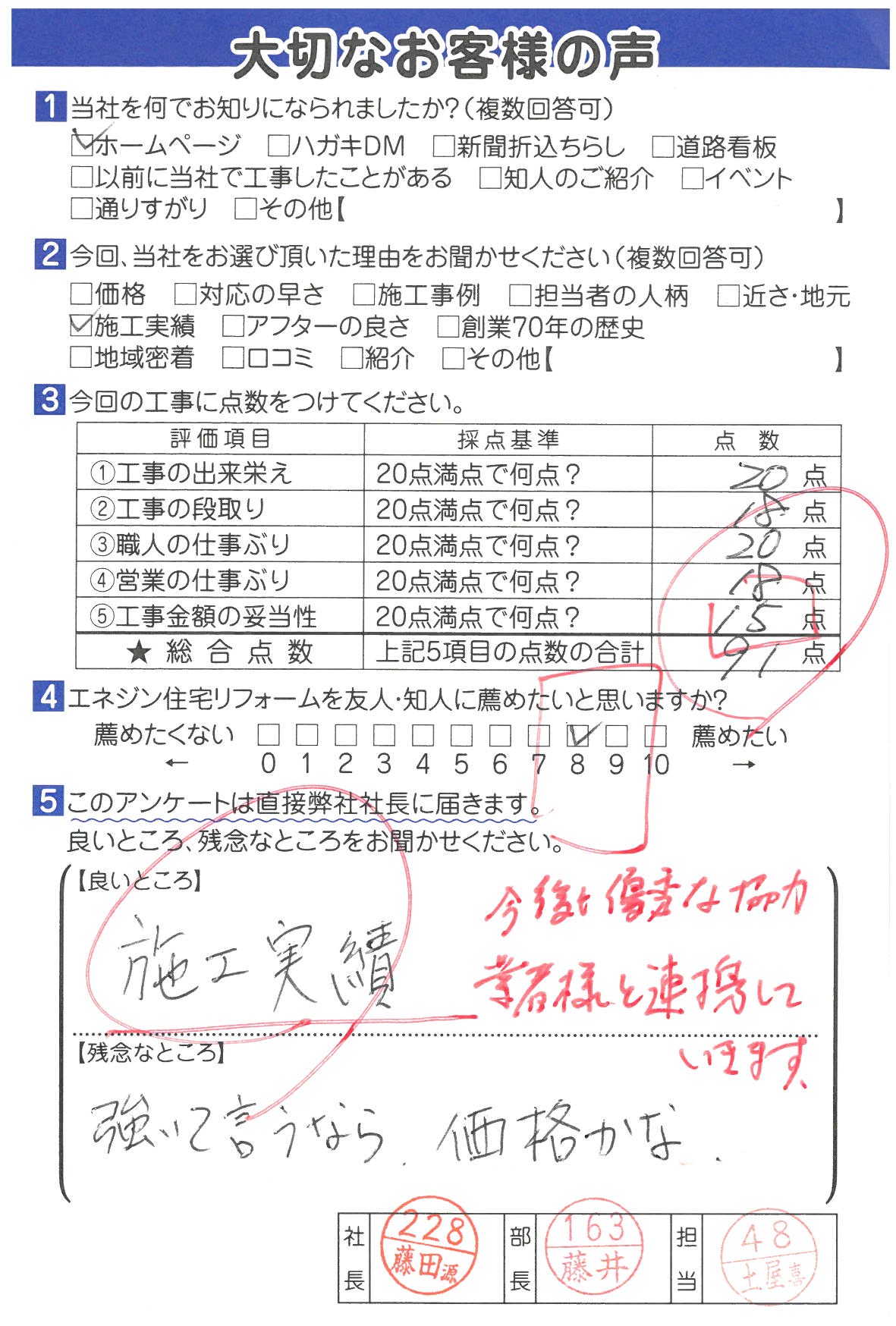 工事の出来栄え 20点満点で何点? 20点