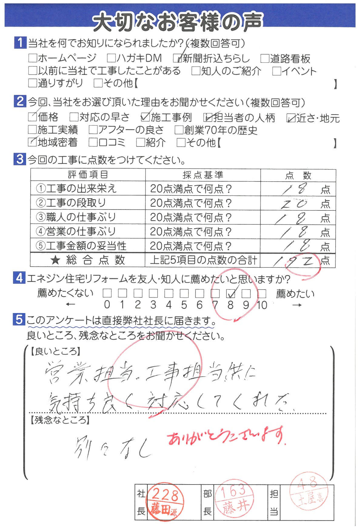 | 工事の出来栄え | 20点満点で何点? | 18点 |