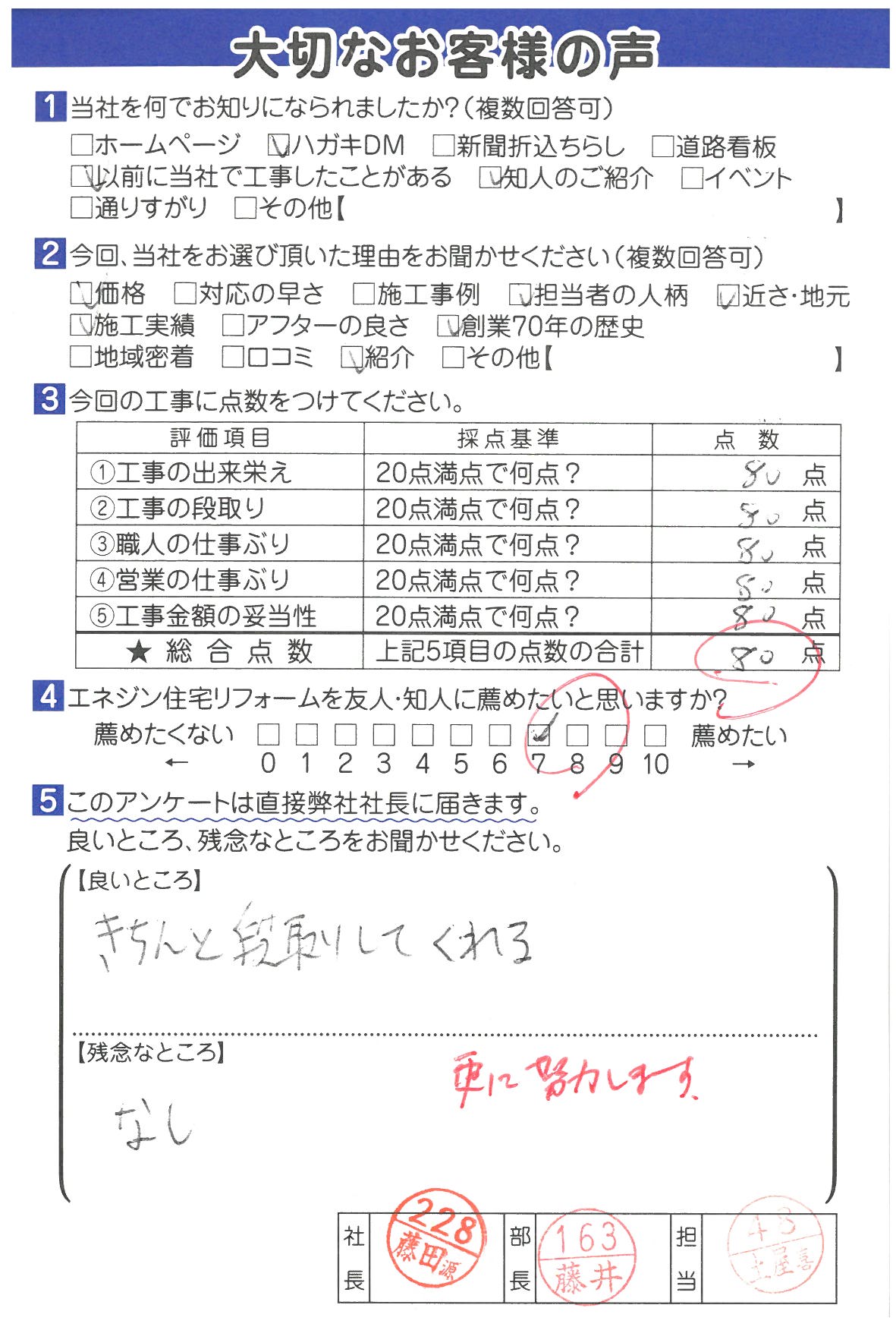 工事の出来栄え 20点満点で何点? 80点